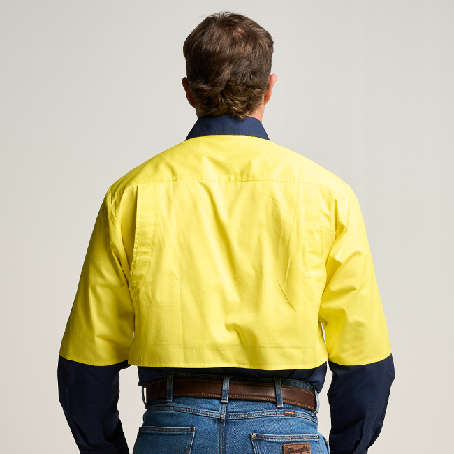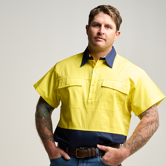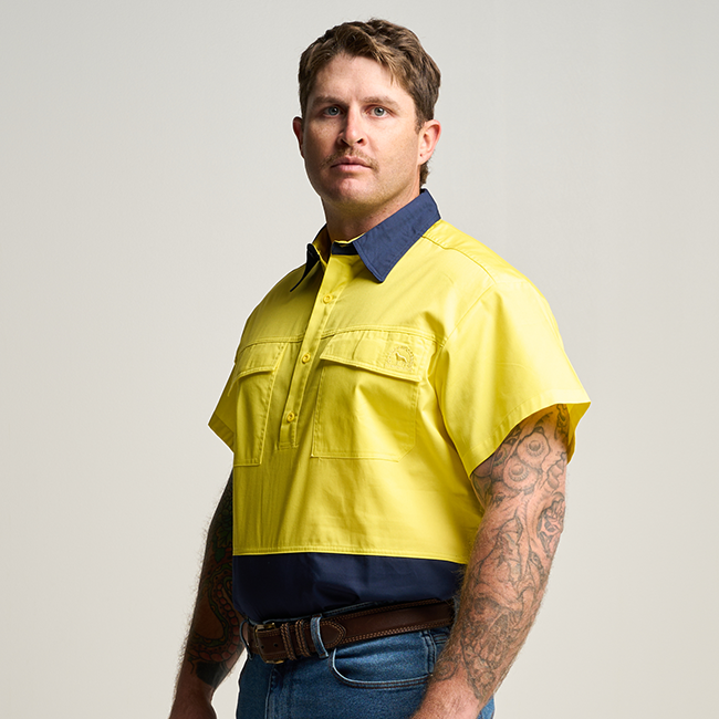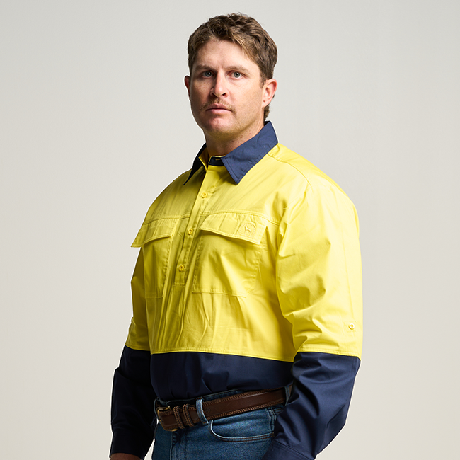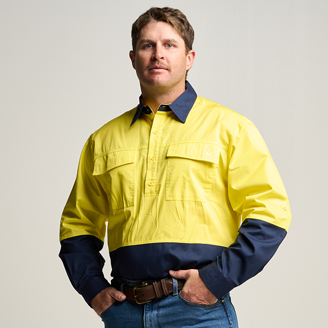 BRAHAM | Mens Half Button Long Sleeve Hi Vis Work Shirt - Yellow / Navy